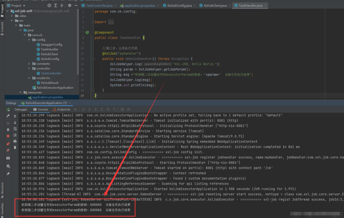 说明:xxl-job-soft中的TaskController,里面方法,使用了Map,这是硬编码,实际项目上不要这样用,这只是为了方便看到向xxl-job-admin请求传参,创建执行器和任务等的方便,你主要是要关心创建执行器后返回的executorId(执行器id)和创建任务返回的taskId(任务id),这两个id需要您存储到你的业务数据库,方便后面,比如启动任务、停止任务、删除任务等等使用;
